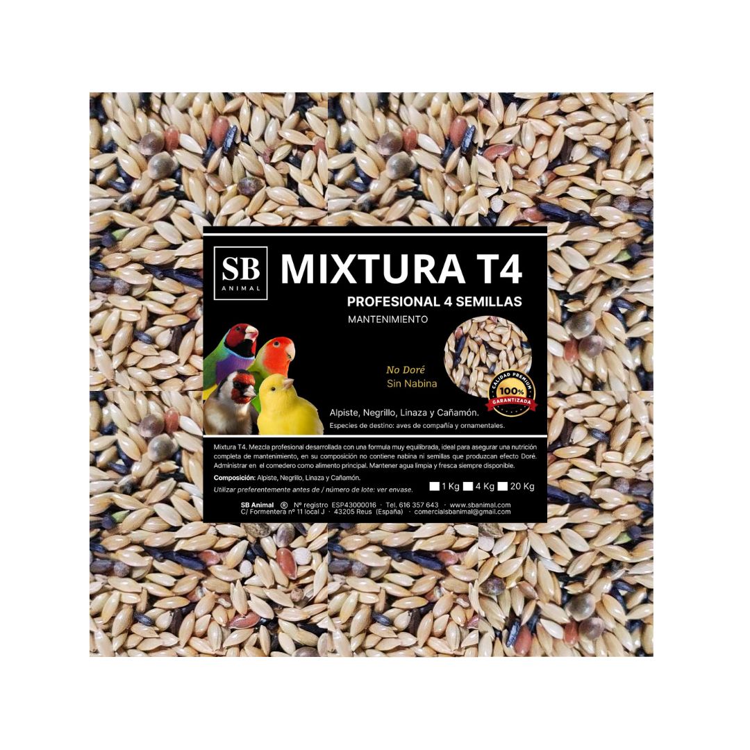 Mixtura T4. Mezcla profesional desarrollada con una formula muy equilibrada, ideal para asegurar una nutrición completa de mantenimiento, en su composición no contiene nabina ni semillas que produzcan efecto Doré.
